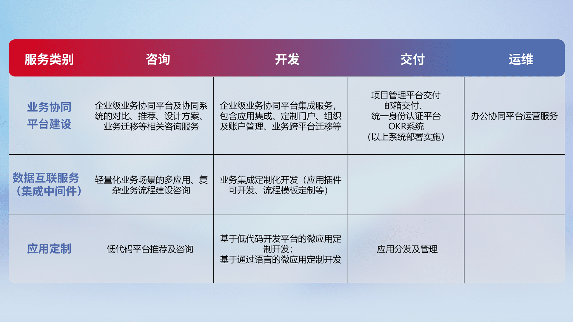 针对钉钉、、、企微、、IDaas等平台级产品提供产品的规划、、、、方案、、、交付、、定制化开发等服务,,,,实现如统一协同办公、、、、智能客户服务、、、混合会议管理、、、智能数据查询、、、等业务场景,,,,实现数字化转型。。。。