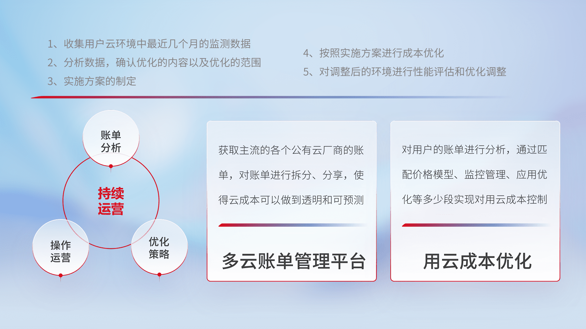 通过灵活运用多种自动化迁移工具,,,,帮助企业用户实现业务和数据高效 、、稳定的上云迁移和云上迁移,,,,采用自研多云纳管平台,,,以中立管理模式,,,解决多组织、、多云、、多运维厂商的复杂关系的管理,,,保证多云平台资源配置的一致性,,,,实时掌控云资源运行数据,,,,运用智能化工具分析云资源多云平台的管理服务,,,,透明化管理成本支出,,用云成本可预测、、用云费用可优化、、、、云资源配额有据可依。。。。